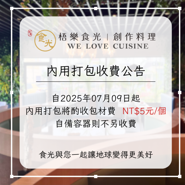 梧樂食光自 2025年7月9日起,針對內用打包餐點收取包材費:
