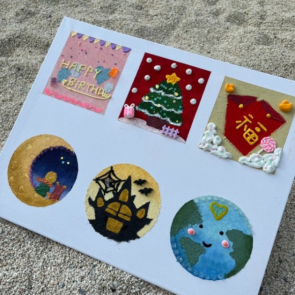 手作內容: 繪製肌理畫作為基底,使用奶油膠配件、黏土裝飾
