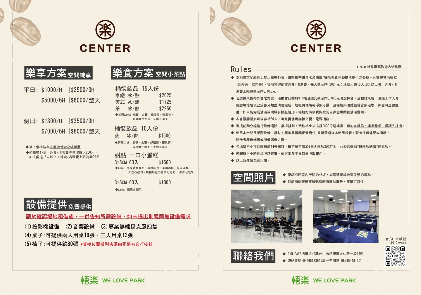 《樂CENTER》提供優質場地服務,無論是講座分享、公司會議、慶生派對、手作教室,我們都致力提供客製化服務,歡迎洽詢梧樂!