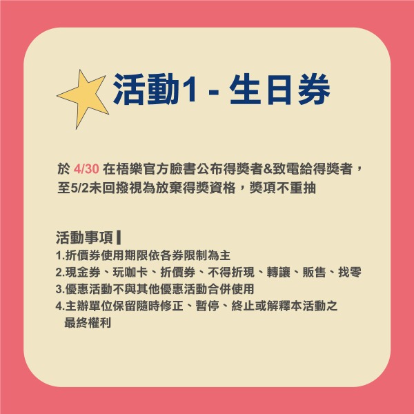 抽獎結果: 於4/30 公布於梧樂臉書,並致電通知,如三通未接,或4/30-5/2之間未回撥,則視為放棄受獎資格,獎項則不再重抽