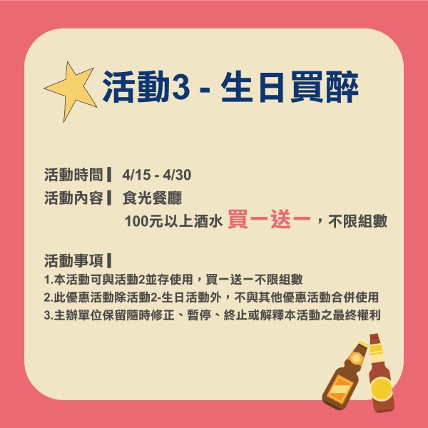 - 食光餐廳:周年慶消費滿1,000送新菜一份