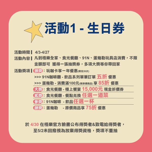 活動內容: 活動期間到梧樂園區的全家、91N咖啡、食光餐廳、蛋幾勒玩具店消費不限金額即可獲得一張抽獎券,抽獎券數量有限領完為止